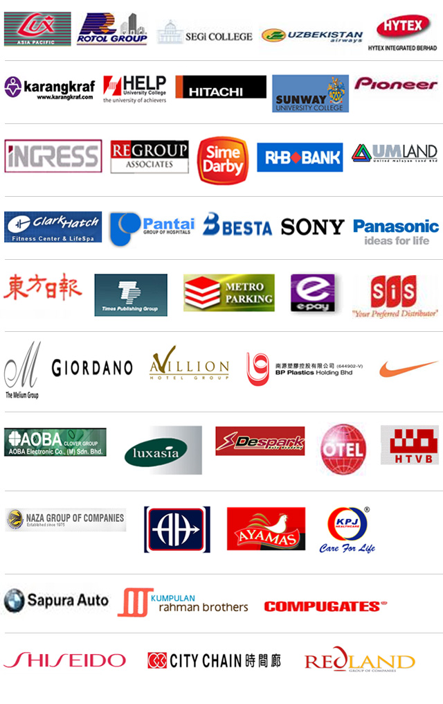 Sony, Panasonic, Hitachi, Giordano, Nike, Sime Darby, RHB Bank and many others.